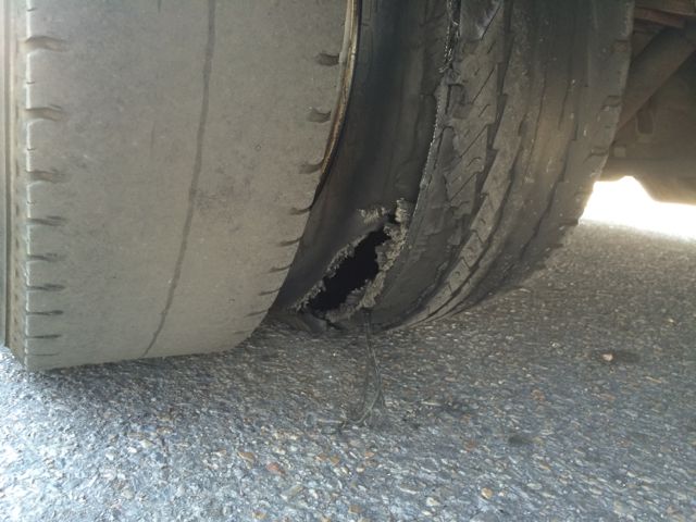 Then we stopped for lunch. As we walked around the truck, we saw a terrible sight. One of the back passenger side tires was blown and torn. The outside tire was also bad. We called the folks up. Luckily, a tire service was just 2 miles away. We cautiously limped to their location.