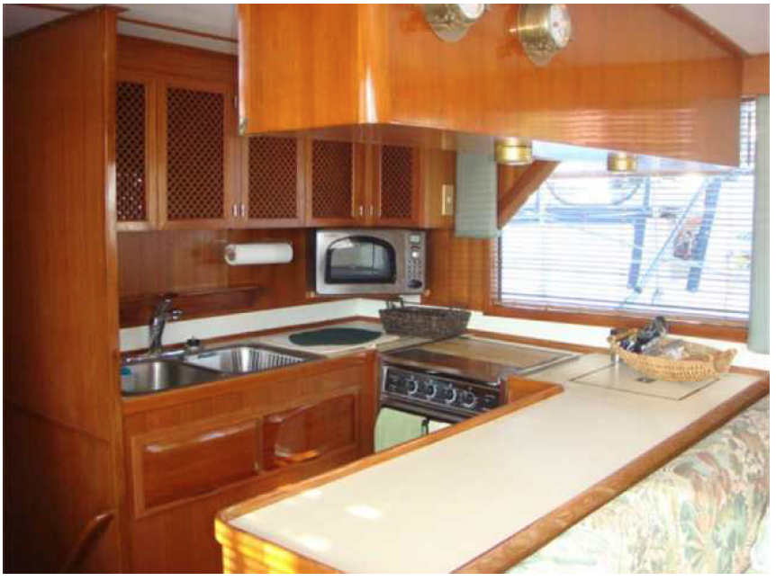Our current kitchen… sorry… galley …. is again a 1 butt galley. 3 steps to the ½ sized refrigerator. I can prep for dinner turn to my left to cook and turn again and I am at the sink. Hahaha No wasted steps for me!! Efficient isn’t even the proper word for it.