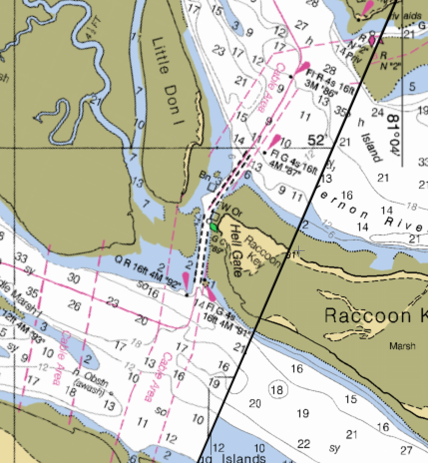 Our challenges for today is to go through “Hell Gate” and “Skidaway Narrows”. Again, everything we read told us to take “Hell Gate” at mid-tide or better. The high tide for today was at 5:30am. We were calculating that by the time we left the Kilkenny and get to “Hell Gate” it would be at mid-tide… a falling tide… but still at mid-tide. You can see the water depth before and after “Hell Gate” is 10 -20 feet. But within “Hell Gate” it was to drop to 6 – 7 ft at mid-tide or better. At low tide, folks have reported less than 3 ft in some places.