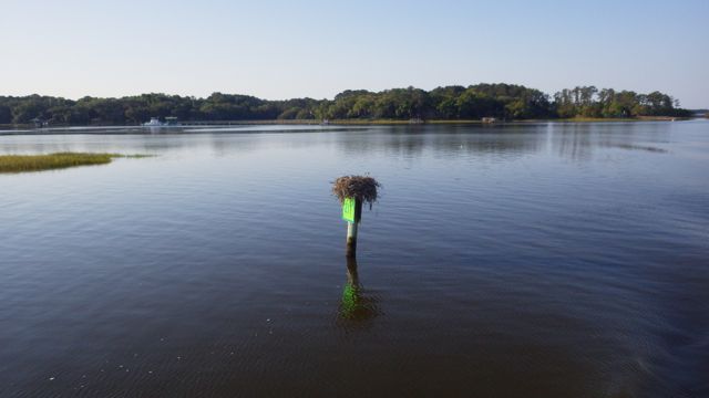 Looks like an Osprey nest on this ICW marker. The marker doesn’t move and a safe place to raise a few young ones. We didn’t see anyone around. OR they were ducking down?! Actually, I am surprised I haven’t seen more wild life along the way. (psst…if you look forward to the left you will see one of the boats we are following today..)