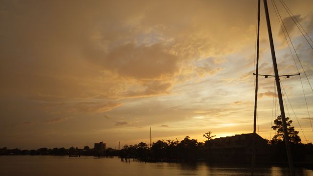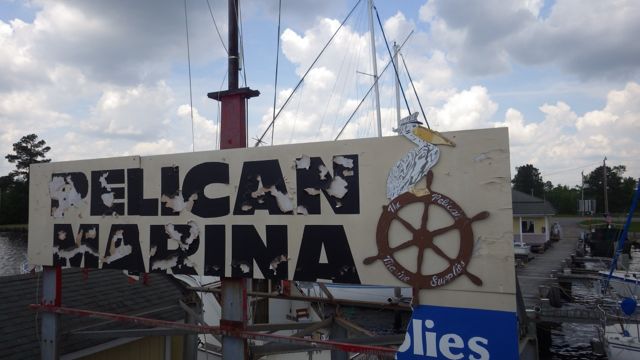 Finally, we are at the Pelican Marina in Elizabeth City, NC. We seem to be the largest boat at the dock. The sign looks like it has seen better days. The dock master said, “you see the dilapidated sign? That is where you will tie up for the night.”