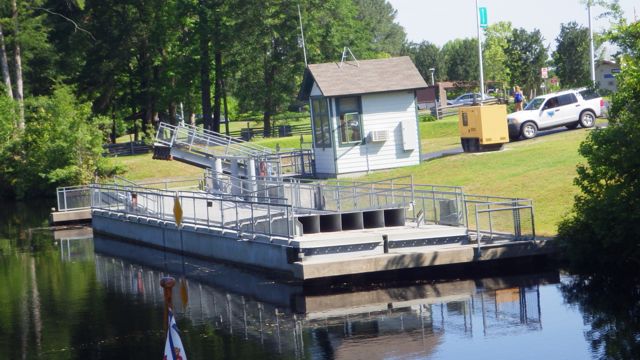 The Great Dismal Swamp Canal has a controlled depth of at least 6 ft. The Corp of Engineers work really hard to keep the canal clear. There are feeder ditches from area lakes as well as locks on both sides of the canal to regulate the water depth. At about 8:10am I noticed a sail boat coming up fast behind us. What? Oh dear, we were so transfixed by the scenery going slow to take it all in that we forgot the time. We increased our speed so as not to miss the 8:30am opening. Oh dear!!