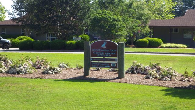 We approached the Great Dismal Swamp Visitor center. It is a road-side park that happens to also manage the pontoon bridge we need to go through. The Visitor center has some picnic tables, walking trails and historical information for the road warrior. The pontoon bridge is to allow people to get over the canal to walk along one of their trails.