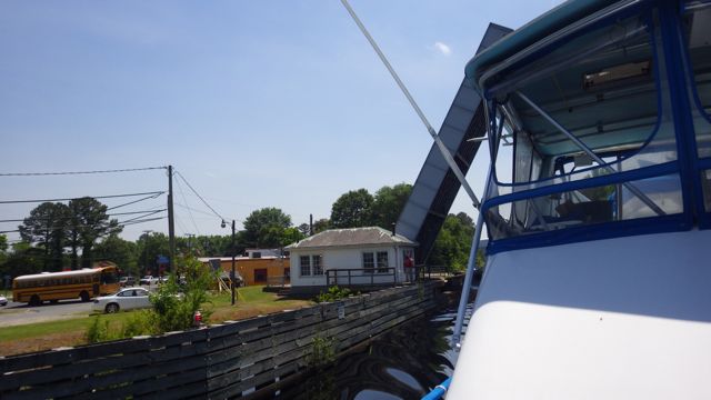 Then we had to wait for the top of the hour for the Great Bridge Bridge to open. Wayne had to keep the boat in the middle of the lock. No current to speak of for about 45 minutes. ugh! We had just missed the opening. There are separate folks that manage the locks and bridge. There is only 6 ft of clearance under the bridge. I don’t think anyone can sneak by if they wanted to.