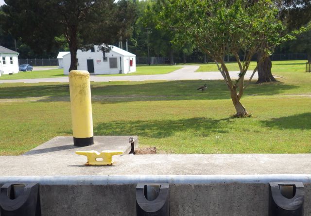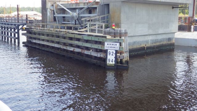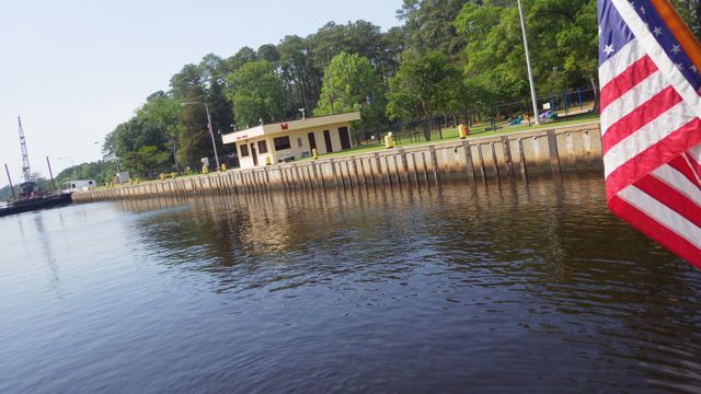 Just beyond the Veteran’s Bridge is the Great Bridge Lock and the Great Bridge Bridge. Really. The lock helps to control the confluence of the different rivers coming into the same location around Norfolk. The Great Bridge Lock just had new fenders put on the south side of the lock. Really nice rubber bumpers. We were asked to tie up just beyond the midpoint. We went up about 2 feet.