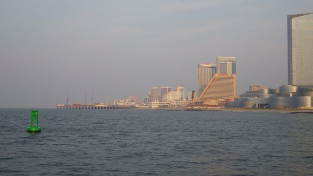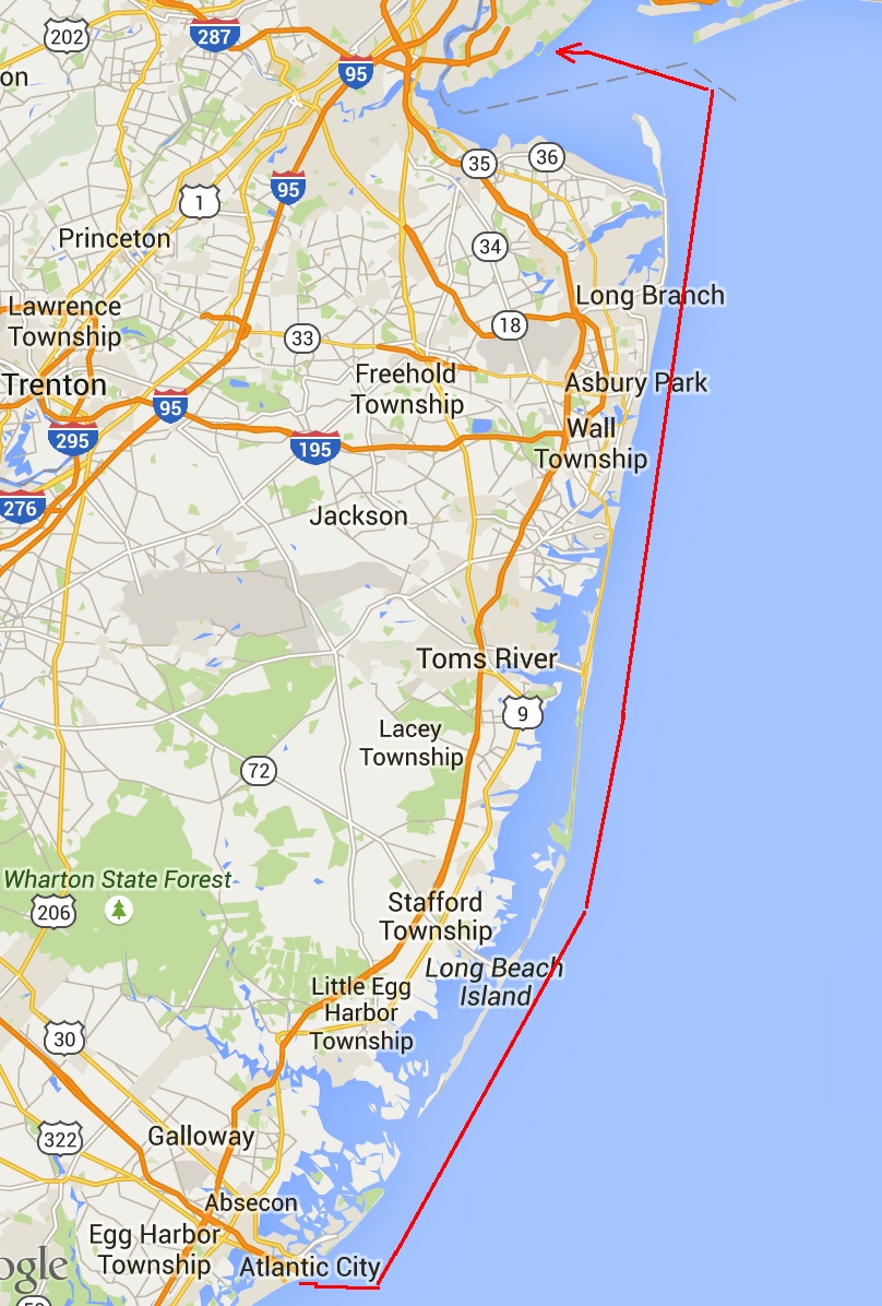 We left the AC, as the locals refer to Atlantic City, and headed north.  We traveled about 1.5 – 2 miles off shore following the coastline.  The red line shows our path from Atlantic City to the small little cove of Great Kills, NY.  We had several locals tell us that there is “absolutely nothing to see along the coast of Jersey”.  So, we made the big trip without stopping.