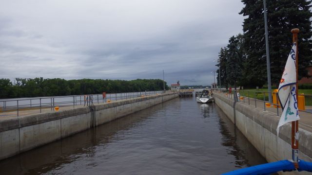 I have the fenders out and standing on the bow as Wayne drives the boat up to the lock. Here we go!! The dam is to the left. Looks just like the Google Map picture above.
