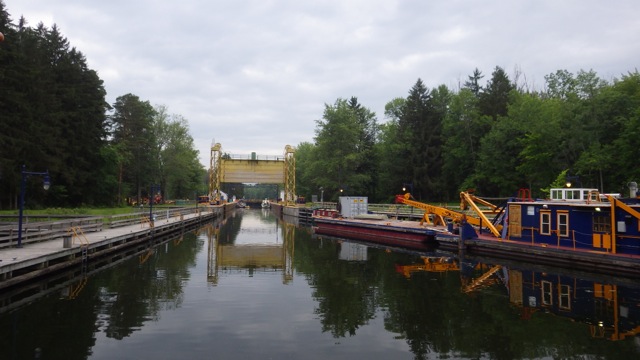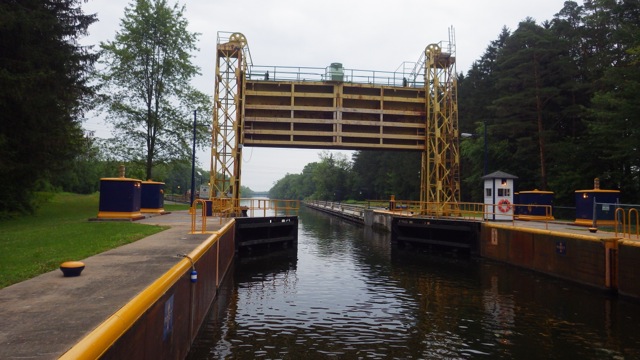 I have no pictures of Lock 5.  Again, the cables were recessed.  I tried to run our line through the cable but it was like threading a needle with a wet noodle using one hand.  I just couldn’t get the line around the cable!  Finally, the lock master came around and wound the line for me.  He even had trouble.  “The water is high right now.  I think I need three hands to go this.”  HE SAID.  Exactly!!   We could hear the other sail boats and power boats struggling as well.  The cables were oddly spaced.