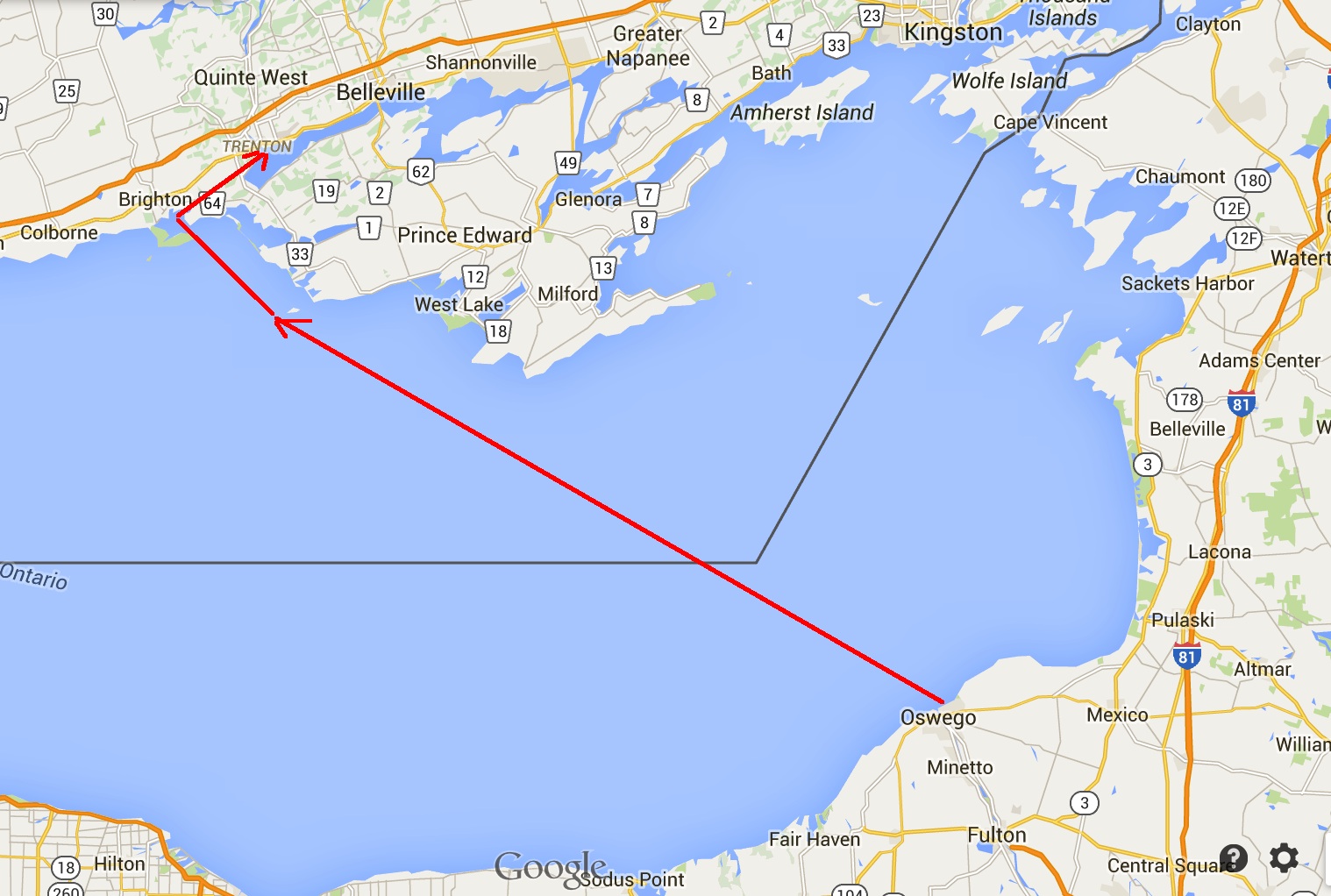Tomorrow we will be joining 2 more Loopers crossing Lake Ontario. How exciting! It will be a 82 mile voyage across Lake Ontario. That black line in the map below is the USA/Canada border. It should take us 9-10 hours to cross over the Lake, pass through the Murray Canal, and cruise into Trenton, ON.