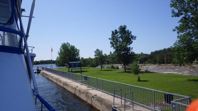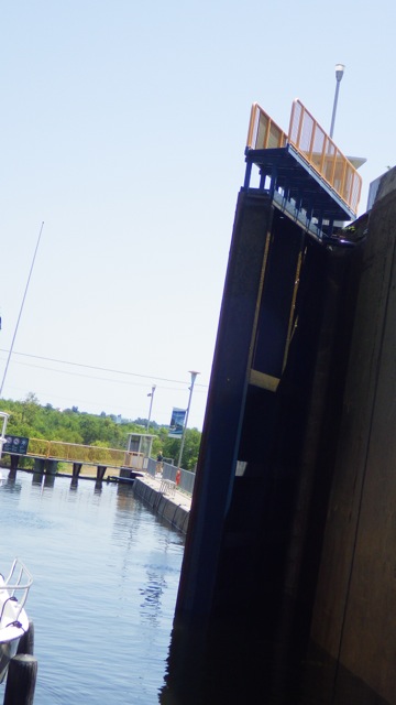 When we first approach locks we have to determine…. where is the door?? See this one?? to the right of the dam or spillway. The little dark square on the right. Is it open? Or closed? I still can’t tell until we get closer! Where did I put my binocs?