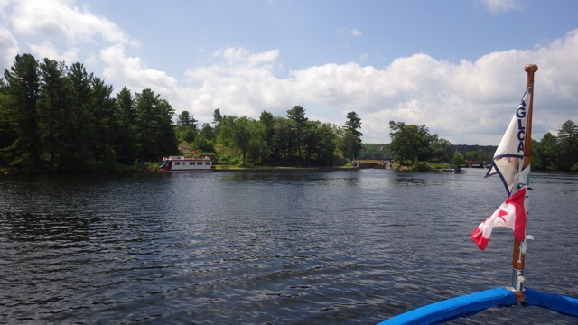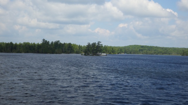 We see houses or “cottages” along the water way. Here are a couple of cottages built on a small piece of rock. The cottage is amongst the trees straight ahead. We almost didn’t see it, ourselves.