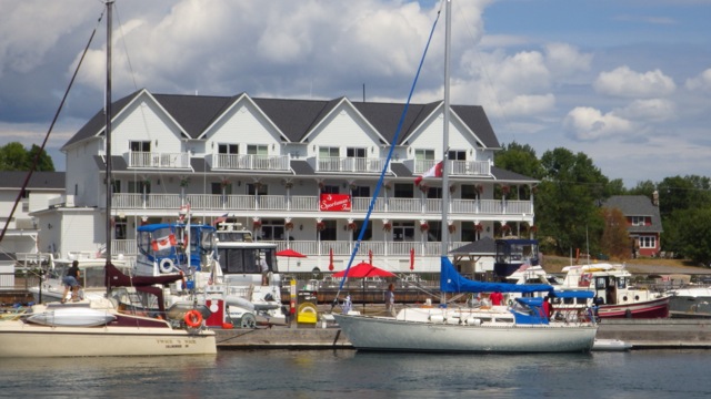 We have chosen The Sportsman Inn for our stay tonight. It was quite congested when we arrived. The woman on the radio mentioned that if we wanted to get out early in the morning, they would have to move some boats around to accommodate that. That sounded very complicated. So we quickly decided to be put on the south-side of the marina rather than the main-side of the marina. The difference? The south-side requires the use of Tinkerbell if you want to go to the marina to check in, the LCBO store, use the marina’s bathrooms/showers, restaurants, or post office. Tinkerbell is the pontoon boat that takes boaters back and forth across the Killarney Channel. We called the marina the first time we needed Tinkerbell. Otherwise, there is a bell at the end of the western pier that you can ring. Actually, you could just shout and say … hey there Tinkerbell!! We were that close.