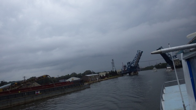 One of the Loopers volunteered to make a phone call at 7am to the next lock to check the availability of getting all of us Loopers through. Then the Looper would relay the message to all the boats. If we know what the status of the lock – how many tows are scheduled to lock through – we would stay on the wall until it was time to lock through. No need to rush up there and wait when we have a perfectly good wall to wait on. The Joliet wall is 2 miles away from the lock. We didn’t need to make phone calls individually. That would have really upset the lock master. Anyway, people started buzzing about their boats right at 7am. The lock master told us we need to get to his lock right away!! For two reasons. The Jefferson Street Drawbridge closes from 7:15am – 8:15am for rush hour. The second reason is he would lock us all down together. No waiting!! We needed to move!!