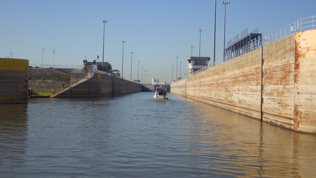 We were drinking our cup of coffee when we heard on the VHF someone asking about a pleasure craft locking through. I called the Lock Master and he told me that “come on” or you will have to wait for the tow which will be in another 1.5 hour wait. We hustled. We threw our lines off and were on the way within 10 minutes. We told our Looper neighbors and they hustled right after us. There was a Looper, Sweet Sensation, waiting patiently for us. There were 4 pleasure craft that glided into the lock as the tow was slowing down just north of the marina.