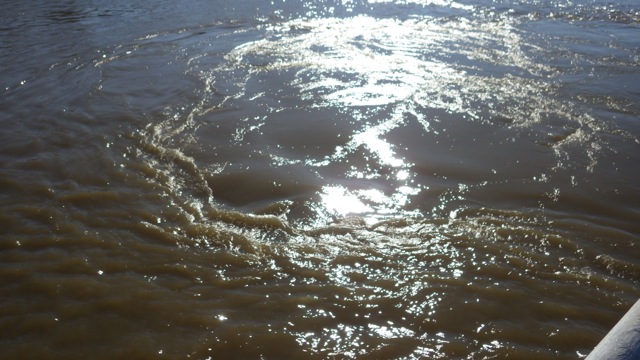 We also heard about the weir dams. They are structures under the water deep enough that we can safely cruise over them. However, and you knew there would be a however…. they cause severe turbulence at some spots especially around corners of the Mississippi. Turbulence is a nice way of saying…whorl pool!! Lots of whorls and circles and frothing waters. I was able to capture one of the circles. Some of the areas look like the water is bubbling from beneath. Fascinating. Keeping both hands on the wheel keeps us true to the channel.