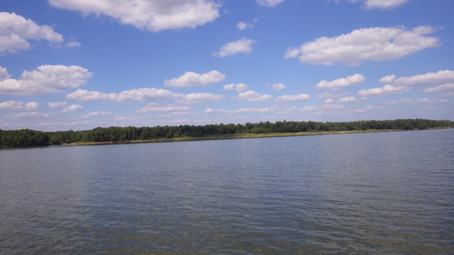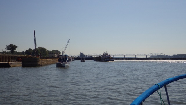 We waited for another 20 minutes after the doors were closed before they started letting the water in. We figured the lock master had to walk from our location a half mile to the controls. We were going up 12 feet. This is a large lock and the first in which we had turbulent water. The normal bouncing off the walls, to and fro kind of fill. Interesting.