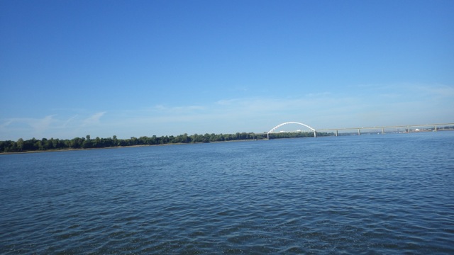 Out of Lock 52. The last lock on the Ohio River!! It only took 3 hours to get through this lock. Some folks have had to wait quite a bit longer. Remember, pleasure crafts have the lowest priorities. We are pleased as punch that we made it on such a beautiful day!