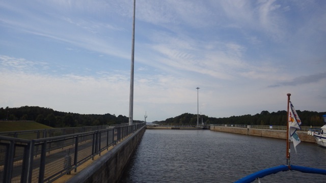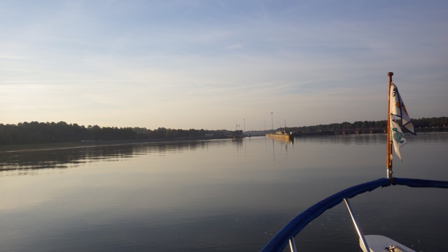 The first lock of the day is right around the corner from Midway. The Dock Master recommended we call the Lock and verify when they would be able to allow a couple of ‘pleasure craft’ to go lock down. If we go through the Fulton Lock easily, then we should have no problem with the rest of the locks today. The Fulton Lock will call the other locks and let them know we are on our way.