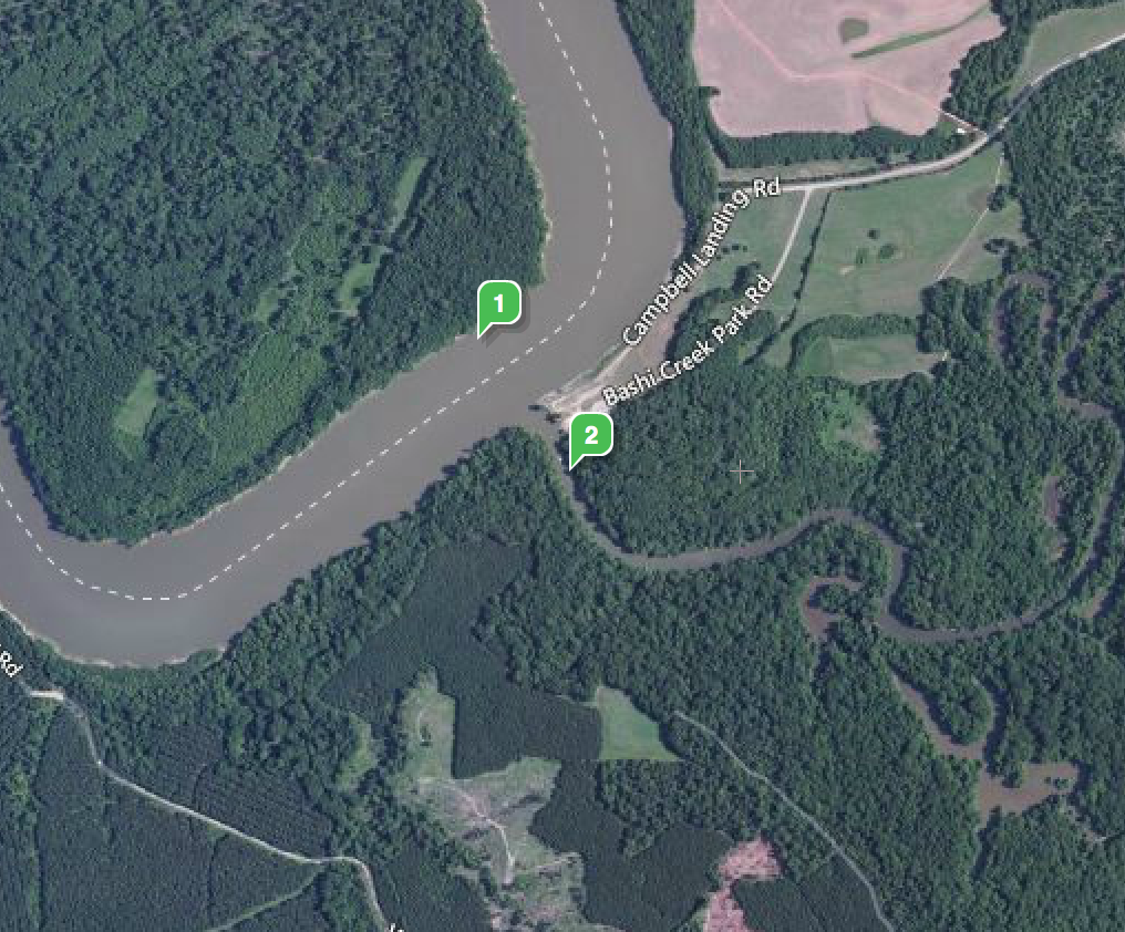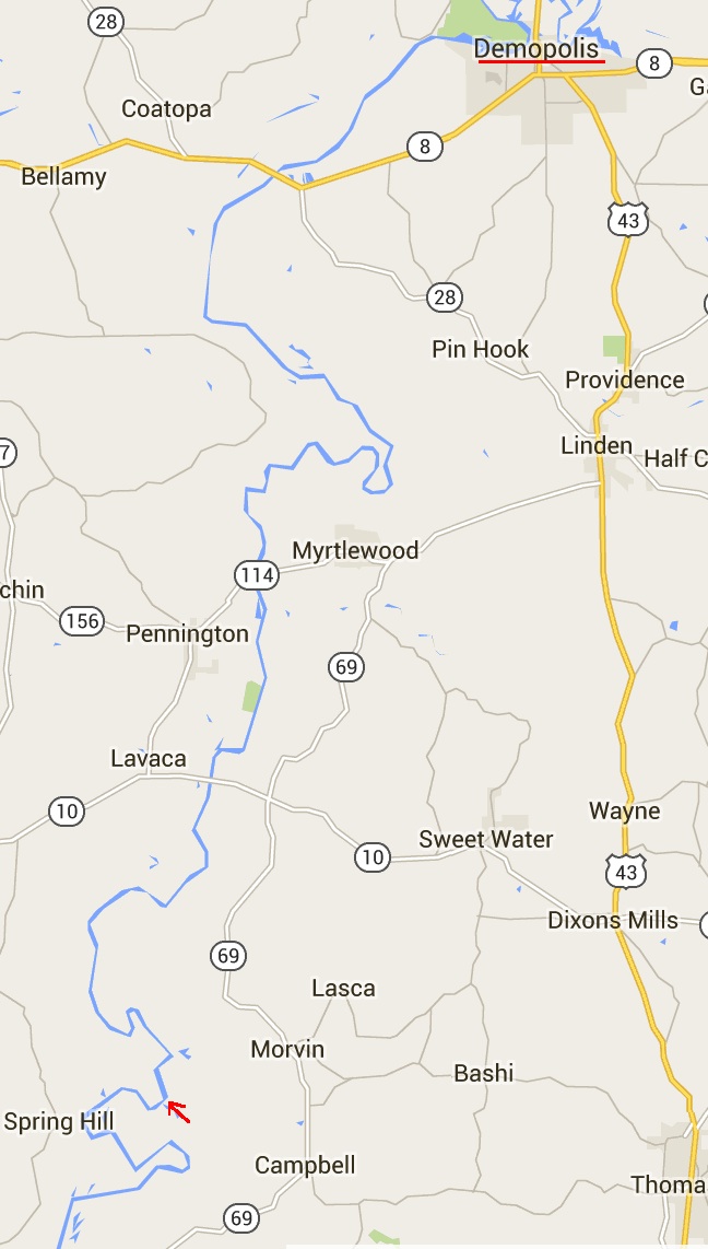 Follow the blue line which is the Black Warrior-Tombigbee Waterway from Demopolis to our anchorage for the night. Definitely not a straight line!