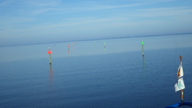 The channel markers leading us out of the marina back into the Choctawhatchee Bay. They look like runway markers, don’t they? It is important for us to stay within the markers since the depth of the waters on either side of the markers is only 2-4 feet. More remarkable is how calm the water is!
