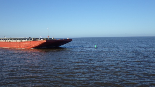We watched the tow approach the Green marker. It looked like it was going to run it over! By the way, the channel was rather shallow around this turn. We were in maybe 7 feet water giving us very little room to move out of the Tow’s way and not hit aground. The tow did run over the marker! It popped right back up after the tow got past it. Glad everything worked out for all of us and the marker! There is another Looper behind us and they will need that marker to stay in the channel.