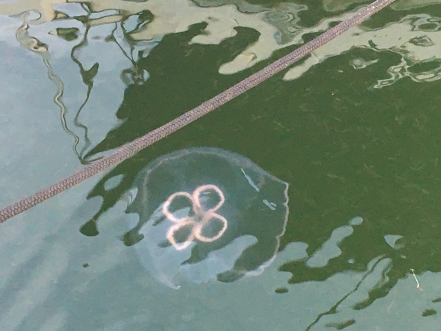 Then the winds and current changed and carried a few Moon Jellyfish and a slew of Sea Nettle Jellyfish into Marina Jacks Marina. One dock mate said he saw a “Man-of-war” floating around. We did not.