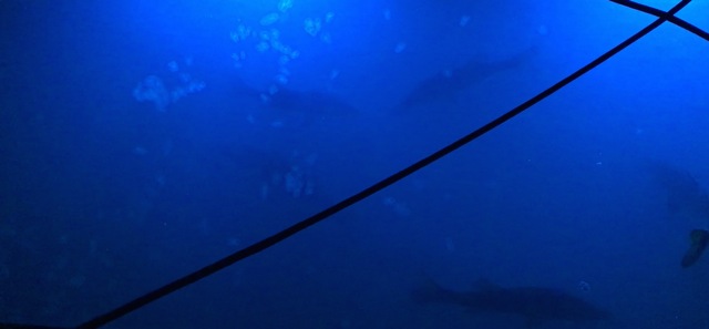 This is an early morning picture of the waters behind a boat on our dock. They have a blue light shining below the water line all night long. In the wee hours of the morning, large fish accumulate to feed off the smaller fish drawn to the light. On top of the water were silver dollar sized floating opaque objects. I recognized them from the Jellyfish display at Mote Aquarium as baby jellyfish.
